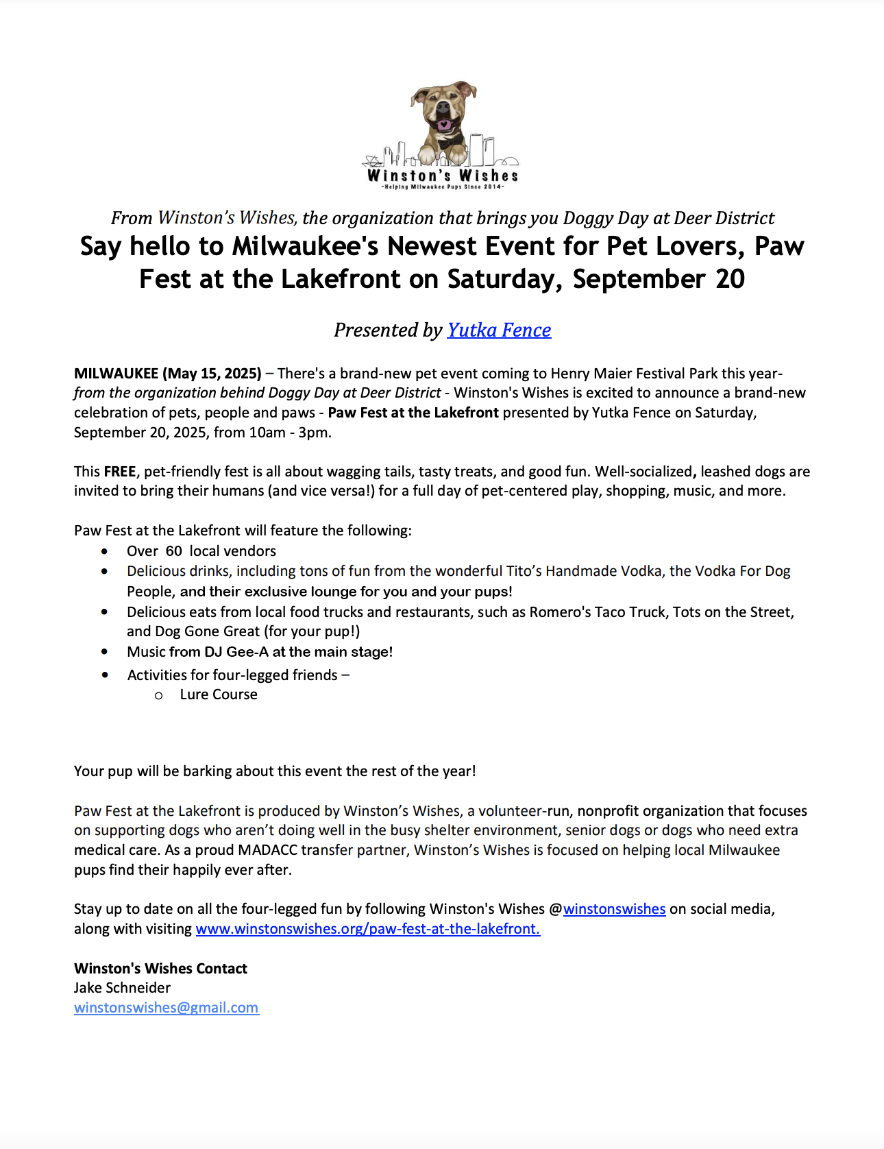 MARK YOUR CALENDARS FOR THE VERY FIRST PAW FEST AT THE LAKEFRONT PRESENTED BY YUTKA FENCE AND BENEFITTING WINSTON’S WISHES